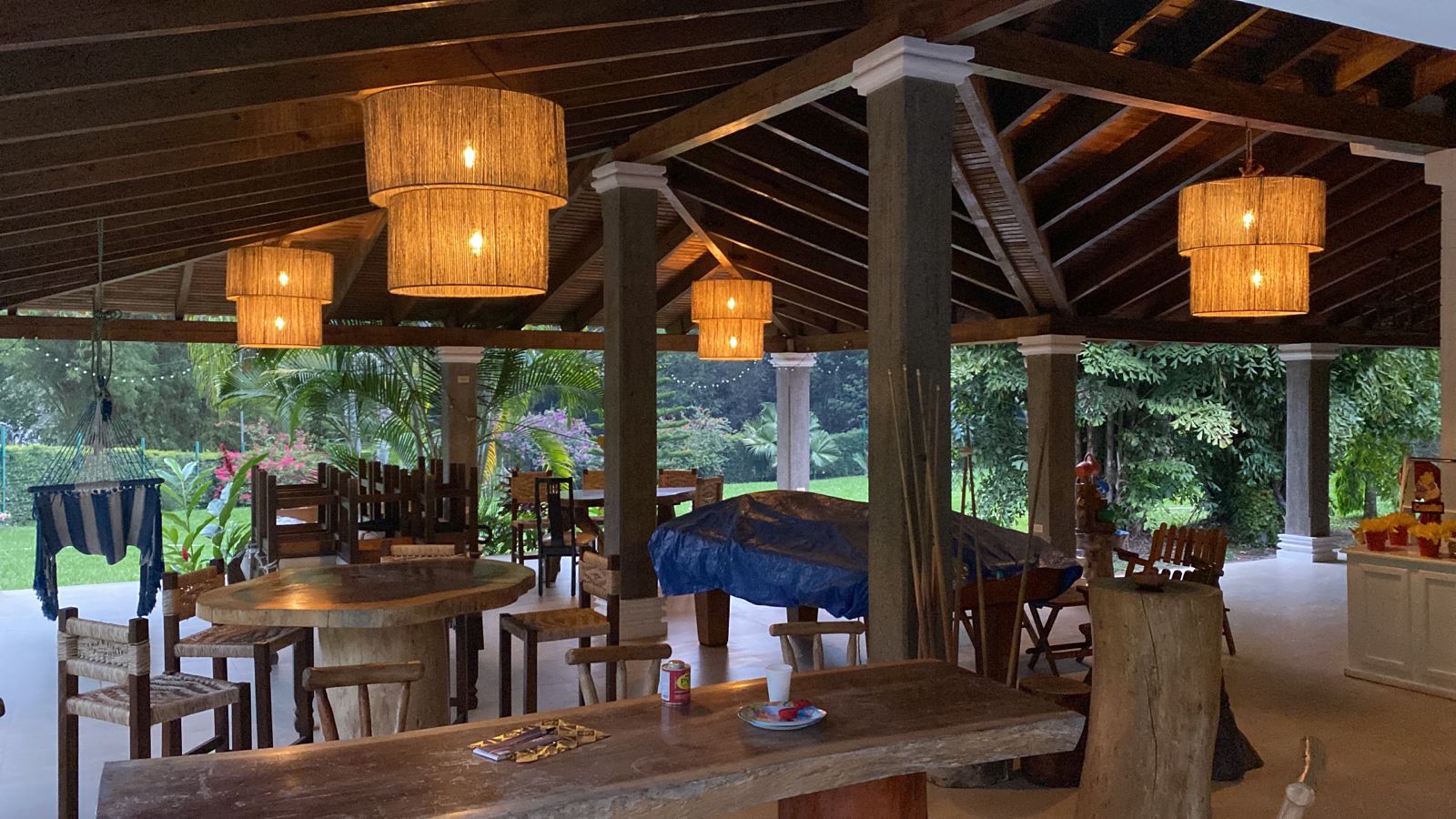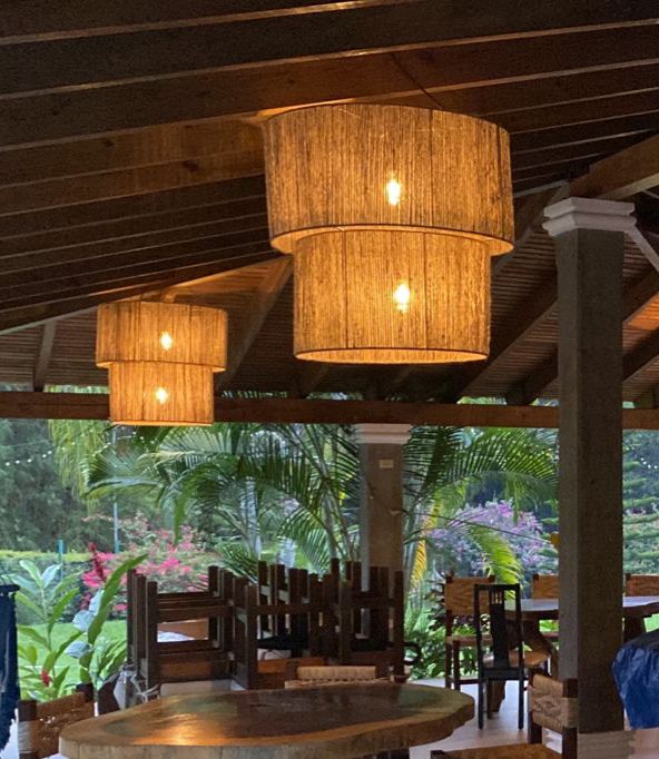 Estas lámparas colgantes de diseño artesanal aportan un toque rústico y acogedor al espacio gracias a su elaboración con fibras naturales, posiblemente hilo de yute o ratán, dispuestas en una forma cilíndrica de doble nivel. Su textura cálida y su tonalidad neutra permiten una iluminación tenue y envolvente, perfecta para crear un ambiente relajado y armonioso en espacios exteriores o interiores con un estilo campestre, boho o tropical. Su presencia en grupo realza la estética del lugar, fusionando la tradición artesanal con la funcionalidad moderna.