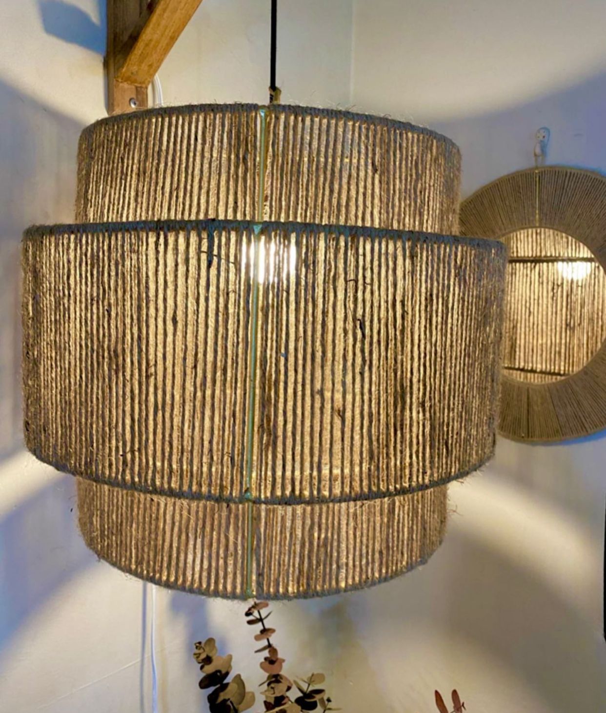 Nuestra lámpara fusiona elegancia y calidez con un diseño artesanal elaborado en hilo de yute. Su estructura cilíndrica de doble nivel aporta profundidad y textura, proyectando una luz suave que crea un ambiente acogedor y natural. El acabado en yute resalta la belleza de los materiales orgánicos, convirtiéndola en una pieza versátil ideal para espacios bohemios, rústicos o minimalistas. Perfecta para iluminar comedores, salas o terrazas, esta lámpara añade un toque de sofisticación y armonía con la naturaleza.