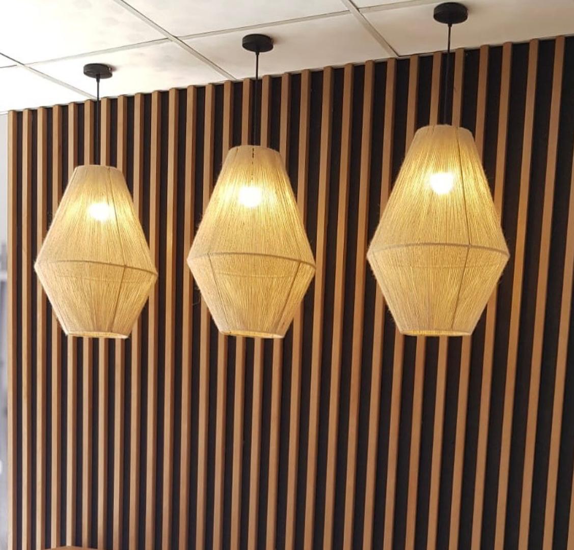 Esta hermosa lámpara elaborada con hilo de yute en forma de diamante le da un toque rustico y delicado a tus espacios.