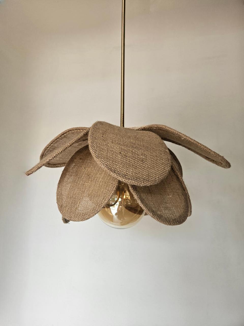 Hermosa lampara inspirada en una flor. Elaborada en tela de Yute para darle un toque orgánico y rustico a tus espacios.