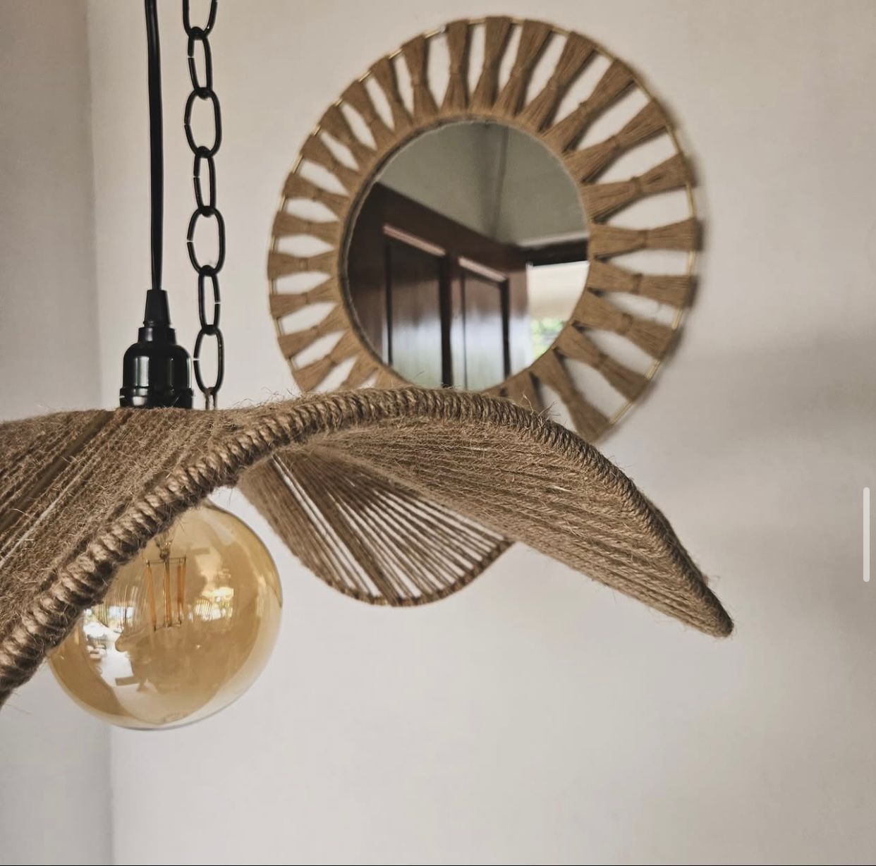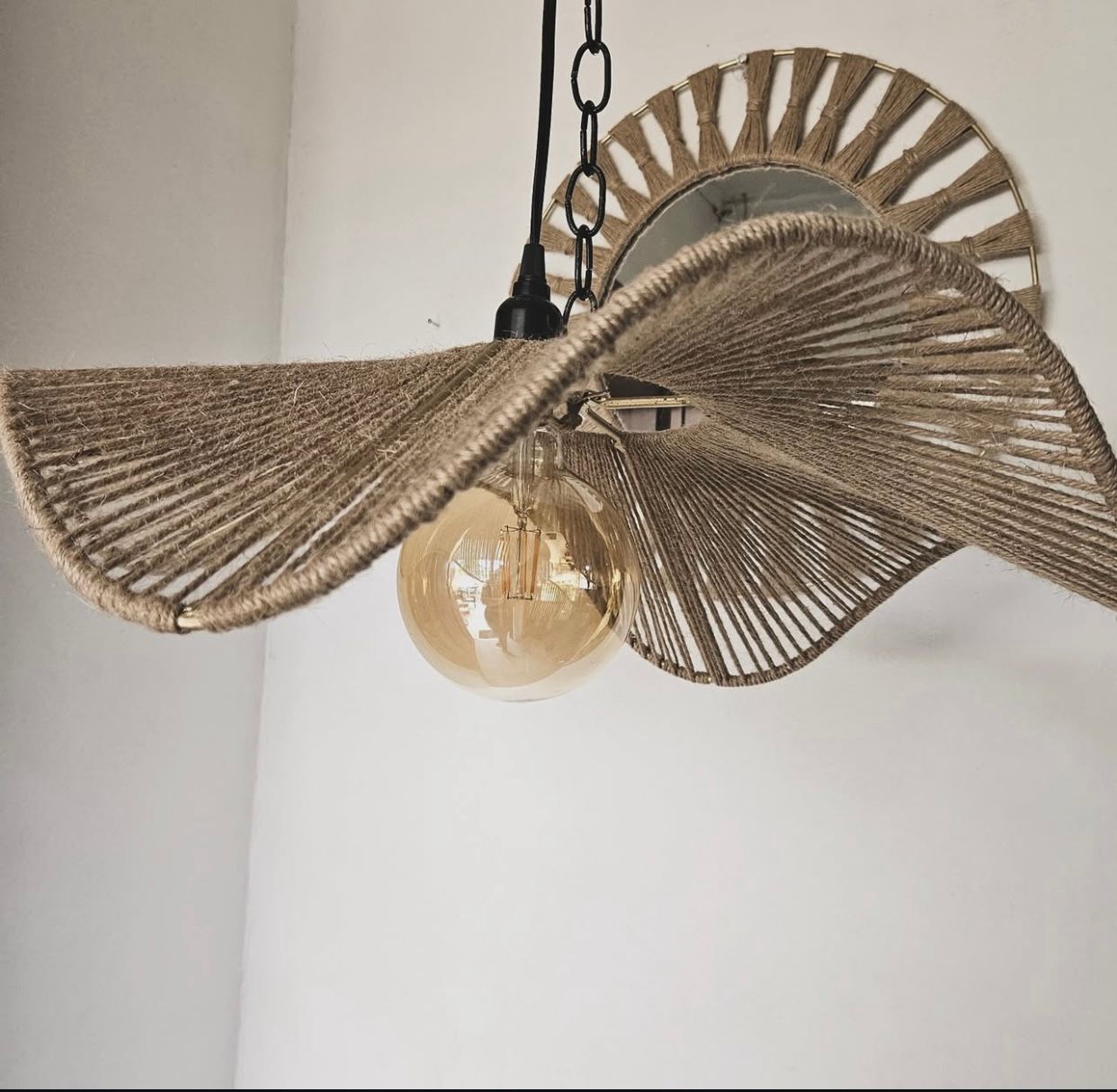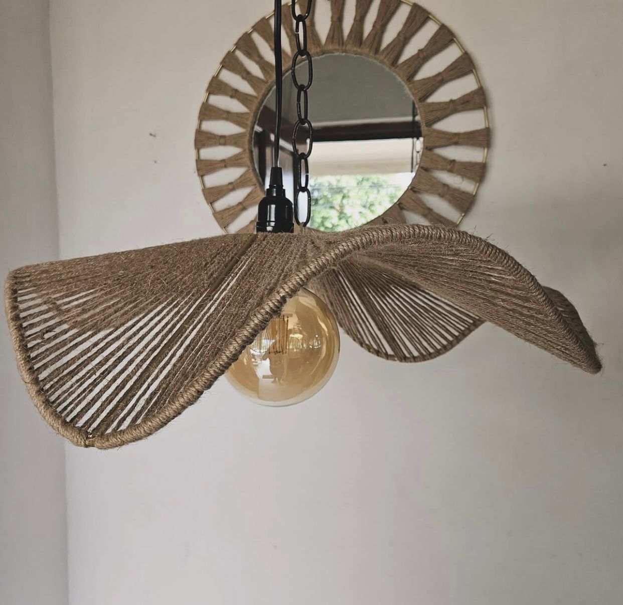 Esta lámpara de yute destaca por su diseño orgánico y fluido, inspirado en formas naturales. Su estructura abierta, tejida a mano con hilo de yute, crea un efecto visual ligero y elegante. Las líneas curvadas aportan movimiento y dinamismo, permitiendo que la luz se proyecte de manera cálida y suave a través de sus fibras. La bombilla expuesta complementa el diseño artesanal, aportando un toque moderno e industrial.
